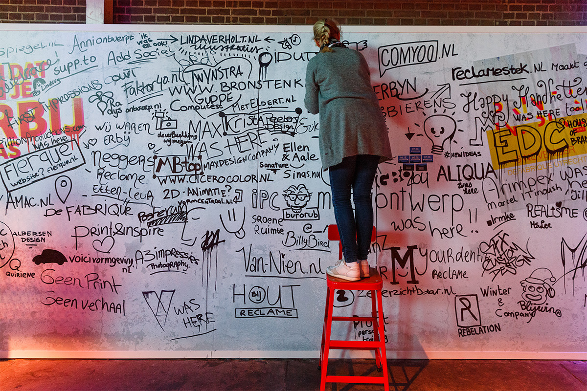 Beursstands die afwijken van het standaardontwerp vallen het meest op. Laat je bezoekers een bijdrage schrijven op een reusachtige krijtbordsticker, op kleine with compliments cards of visitekaartjes met invulvelden. Wil je een ruwe stenen muur, een houten vlonder of een speels patroon? Stickers en vloervinyl maken het mogelijk zonder fysieke aanpassingen. Schappendisplays kunnen helpen om je product mooi te presenteren zonder dat het te druk oogt.